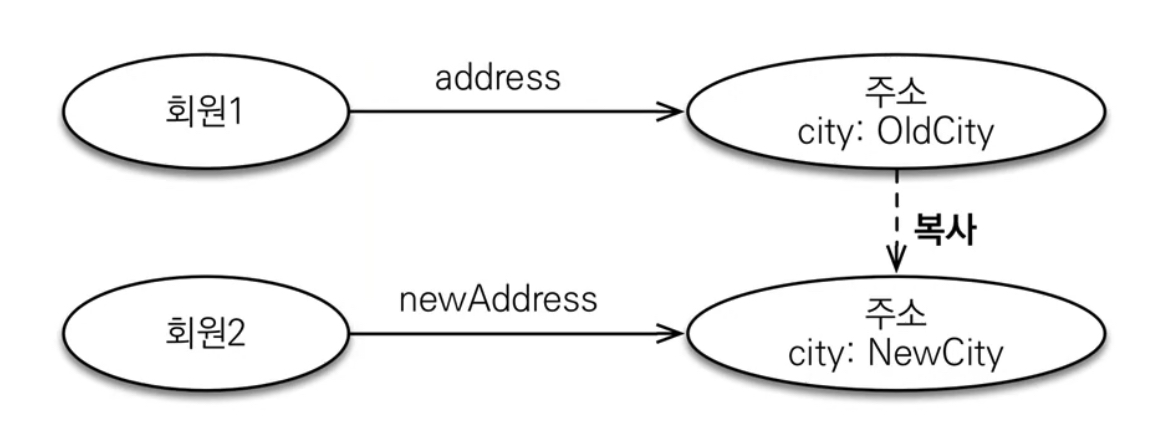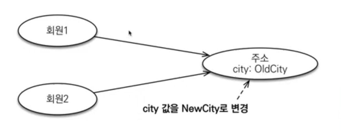 - 임베디드 타입 같은 값 타입을 여러 엔티티에서 공유하면 위험함