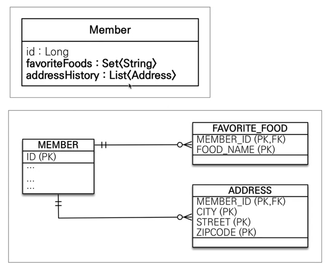 관계형 데이터 베이스는 기본적으로 컬렉션을 내부적으로 컬렉션을 넣을 수가 없다. 값만 넣을 수 있음