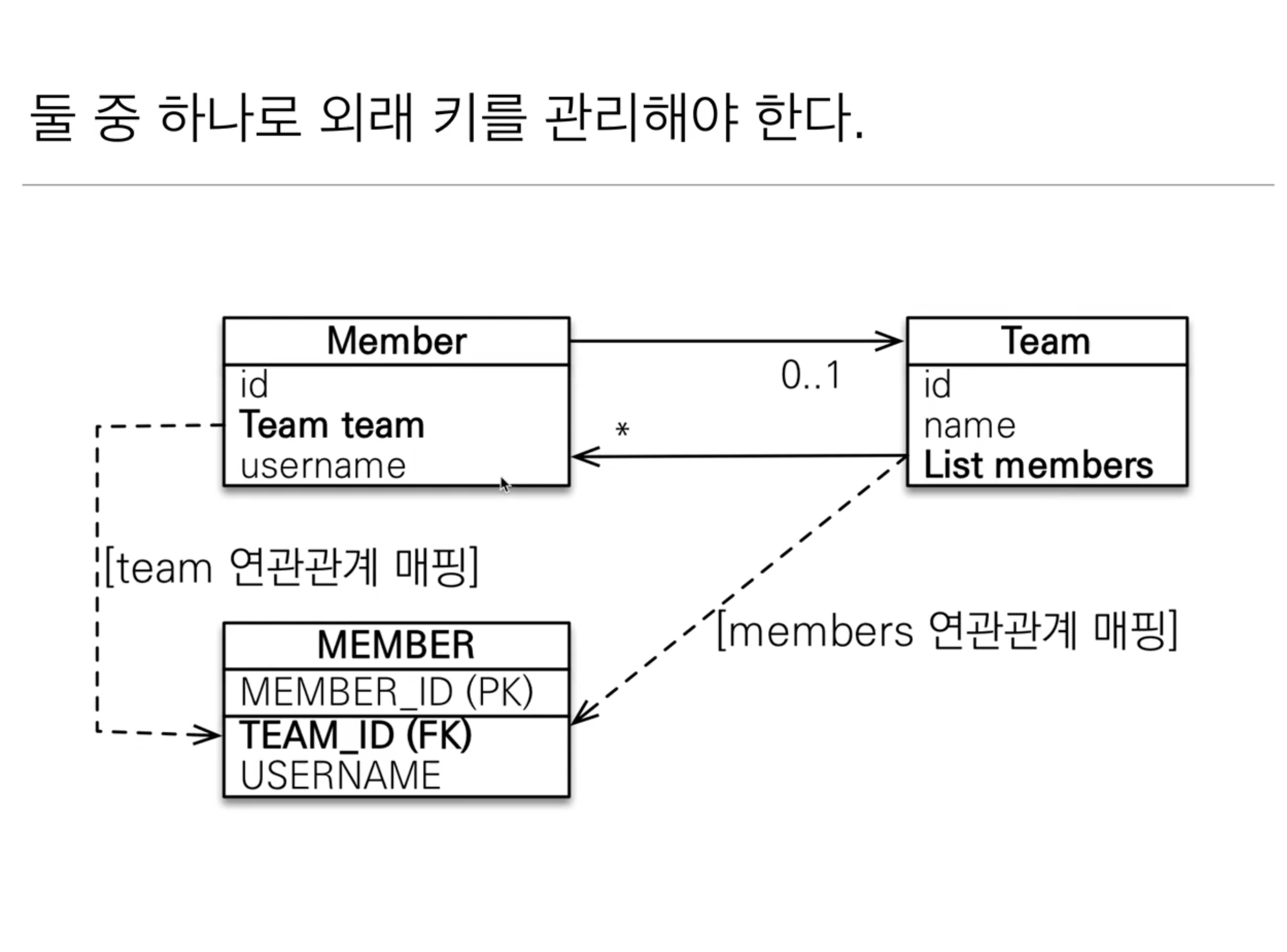 - 서로 양방향 연관관계에 있는 두 객체 중 하나를 연관관계의 주인으로 지정해주어야 한다.