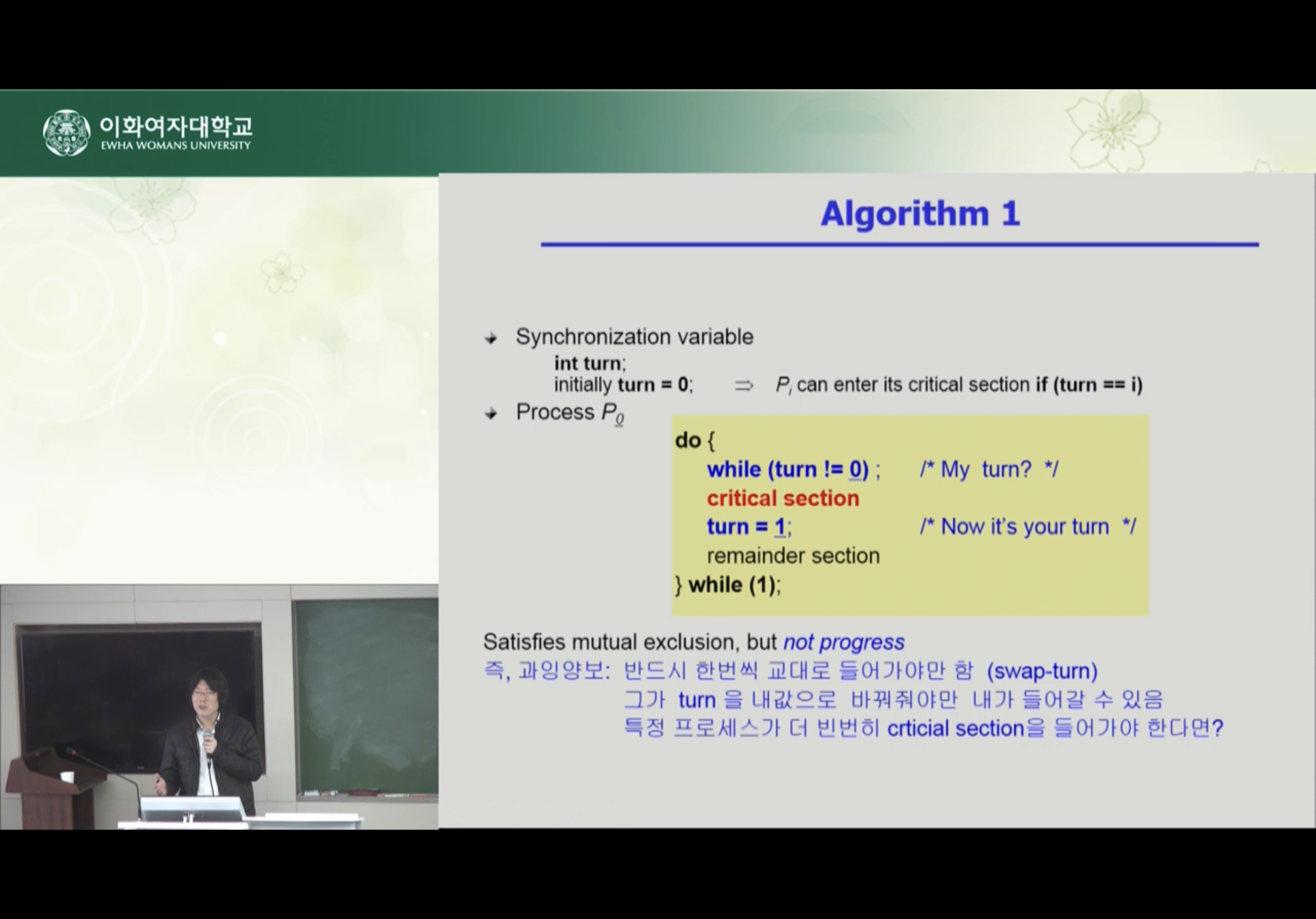 Mutual Exclusion(상호배제) 조건을 만족하지만 Progress / Bounded Waiting 조건을 만족하지 못할 수 있음.