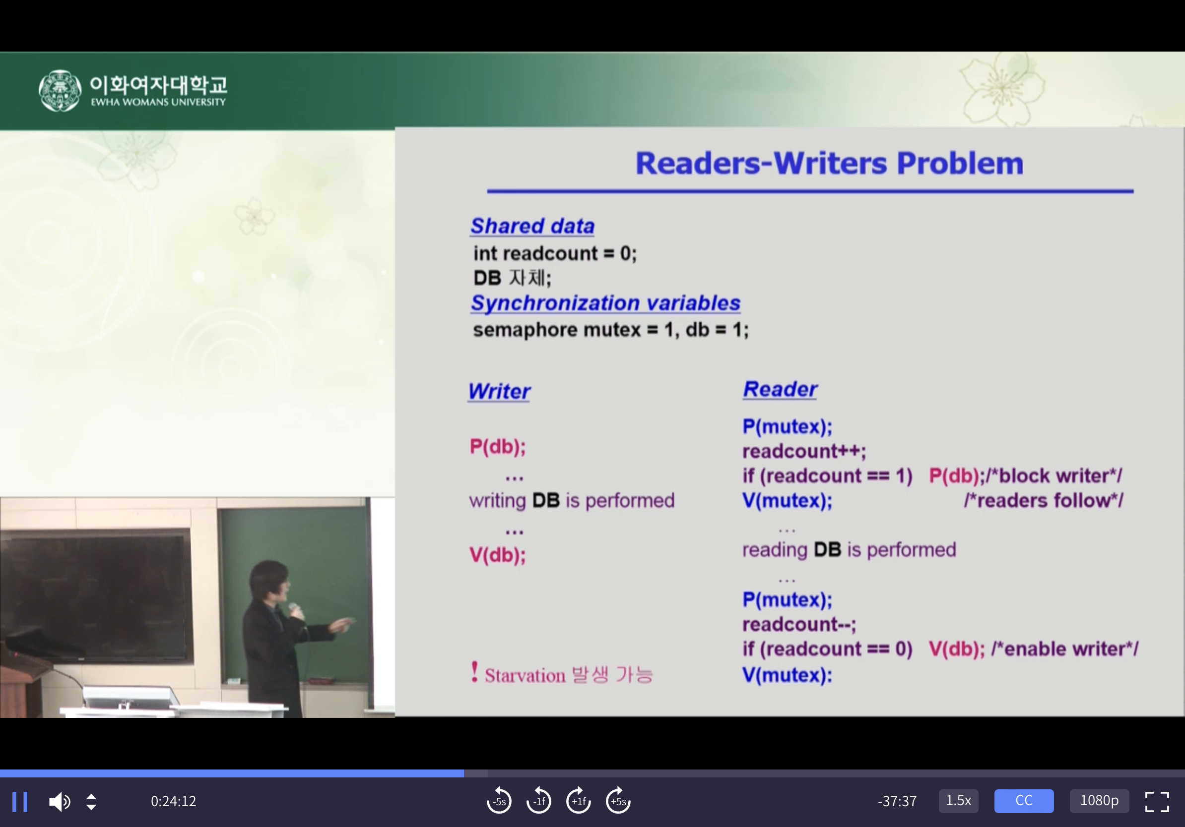 모든 Reader가 빠져나가야 Writer가 진입할 수 있는데 만약 마지막 Reader 하나를 남기고 또 100개의 Reader가 들어오면 Writer는 계속 기다릴 수밖에 없음