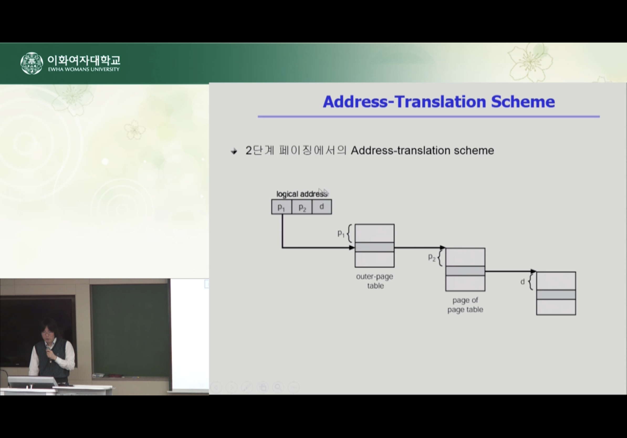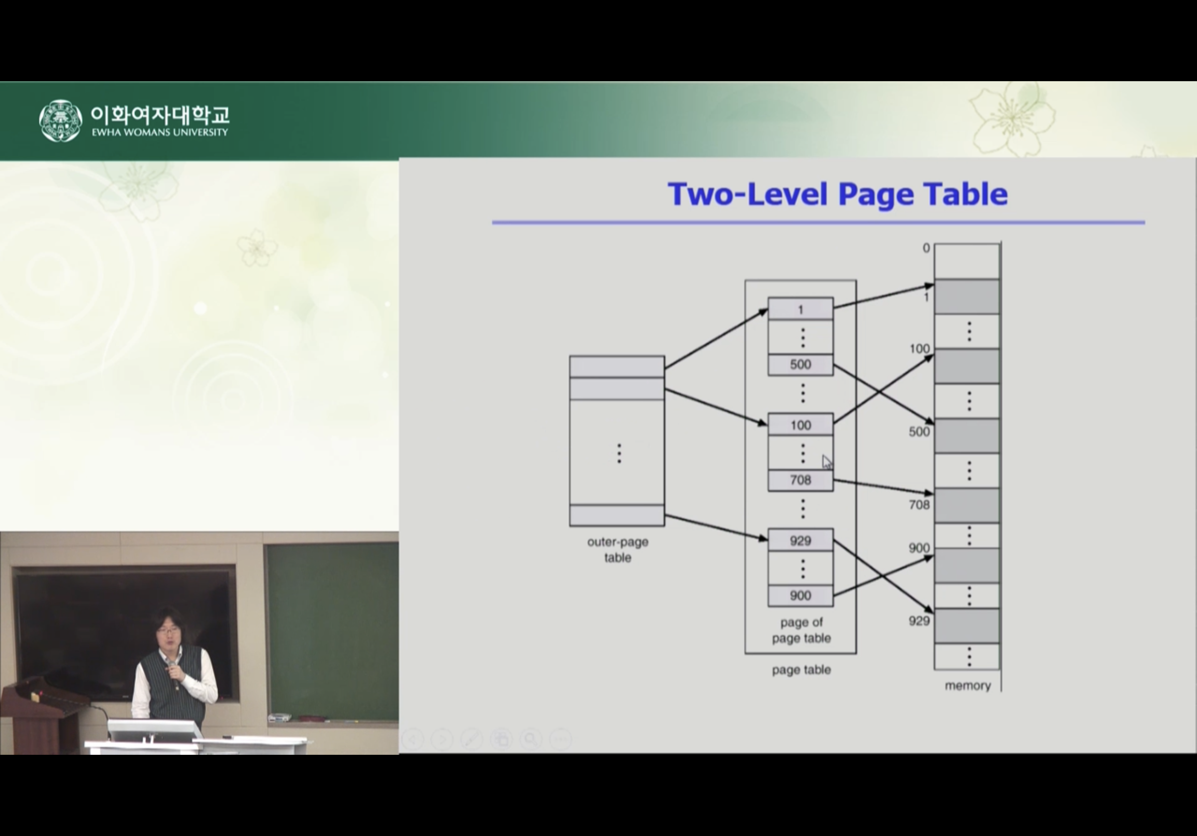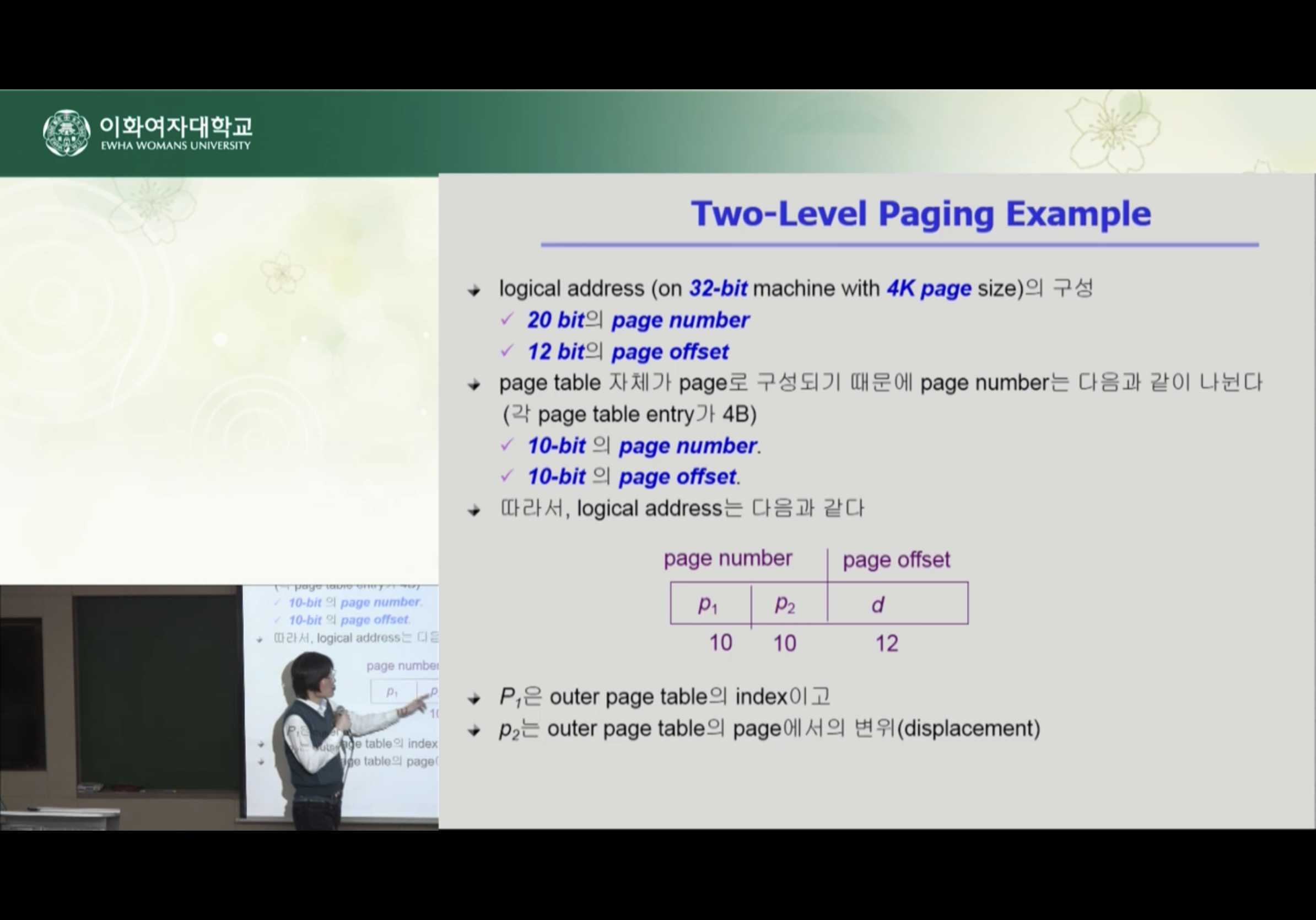 CPU가 논리적인 주소를 주게 되면 페이지 테이블을 2단계 거쳐서 물리적 테이블 주소를 얻게 된다.