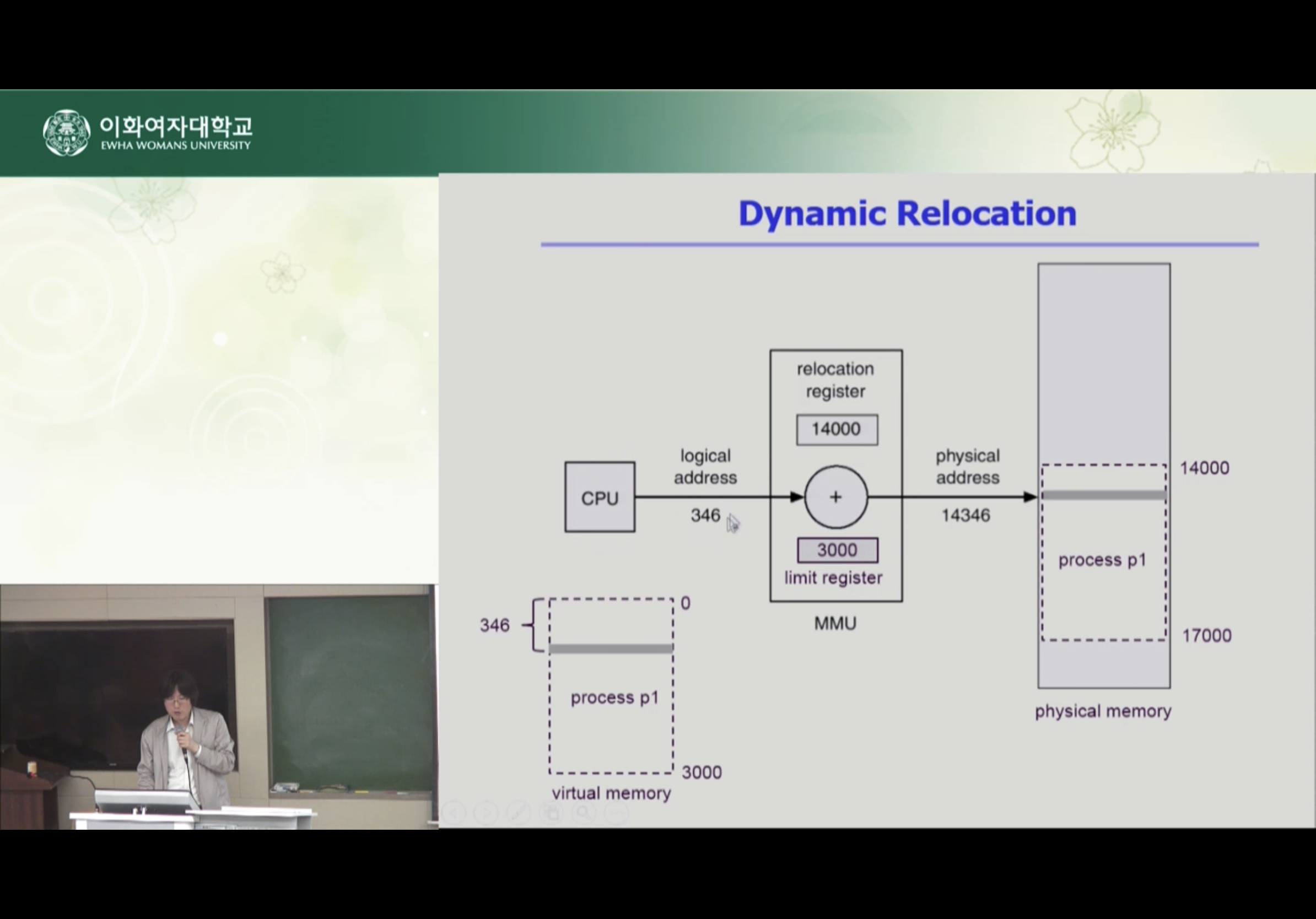 사용자 프로세스가 CPU에서 수행되며 생성해내는 모든 주소값에 대해 base register(=relocation register)의 값을 더한다.