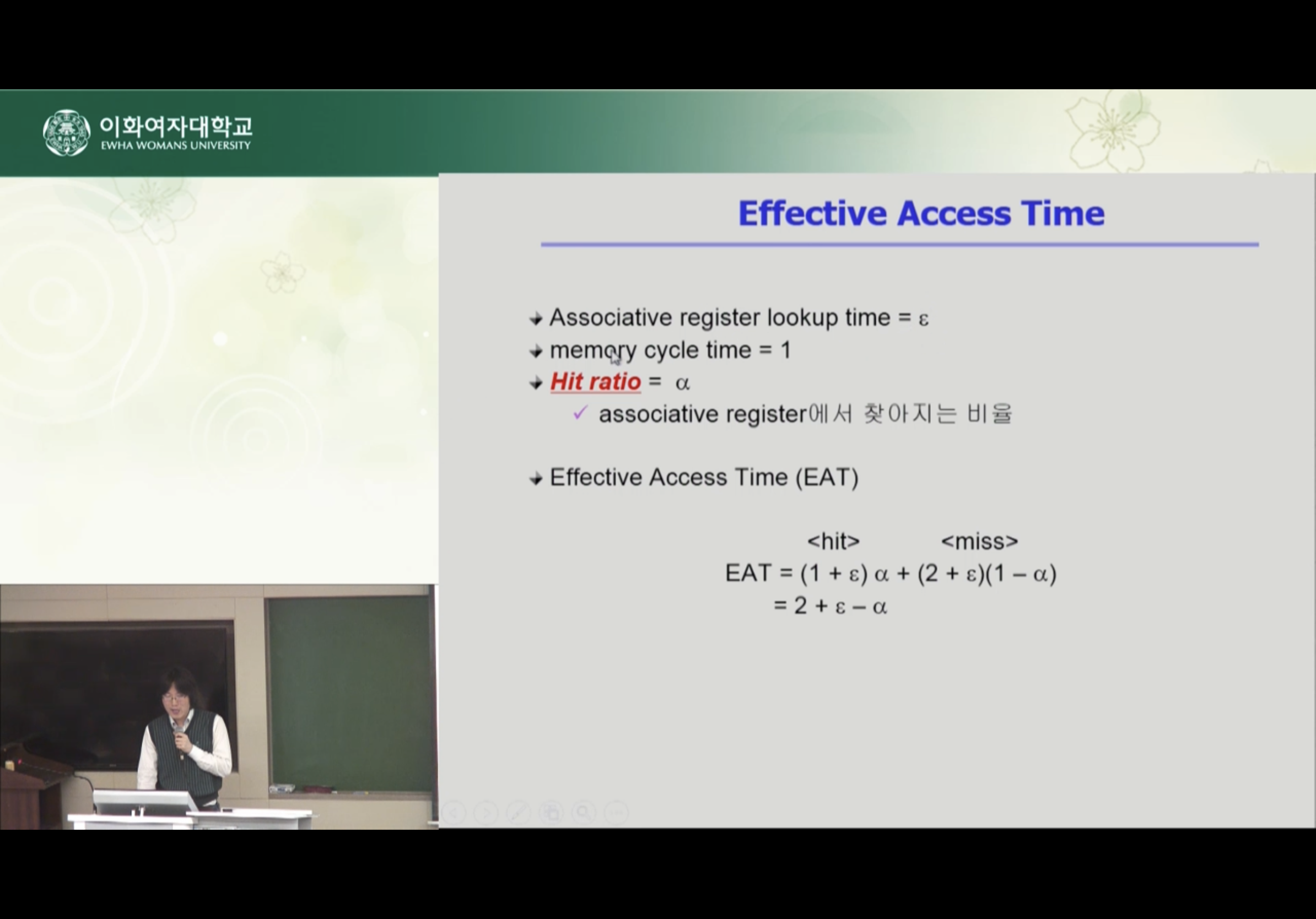 - TLB에 접근하는 시간을 엡실론이라 했을 때 엡실론은 메인 메모리에 접근하는 시간인 1보다 작다.