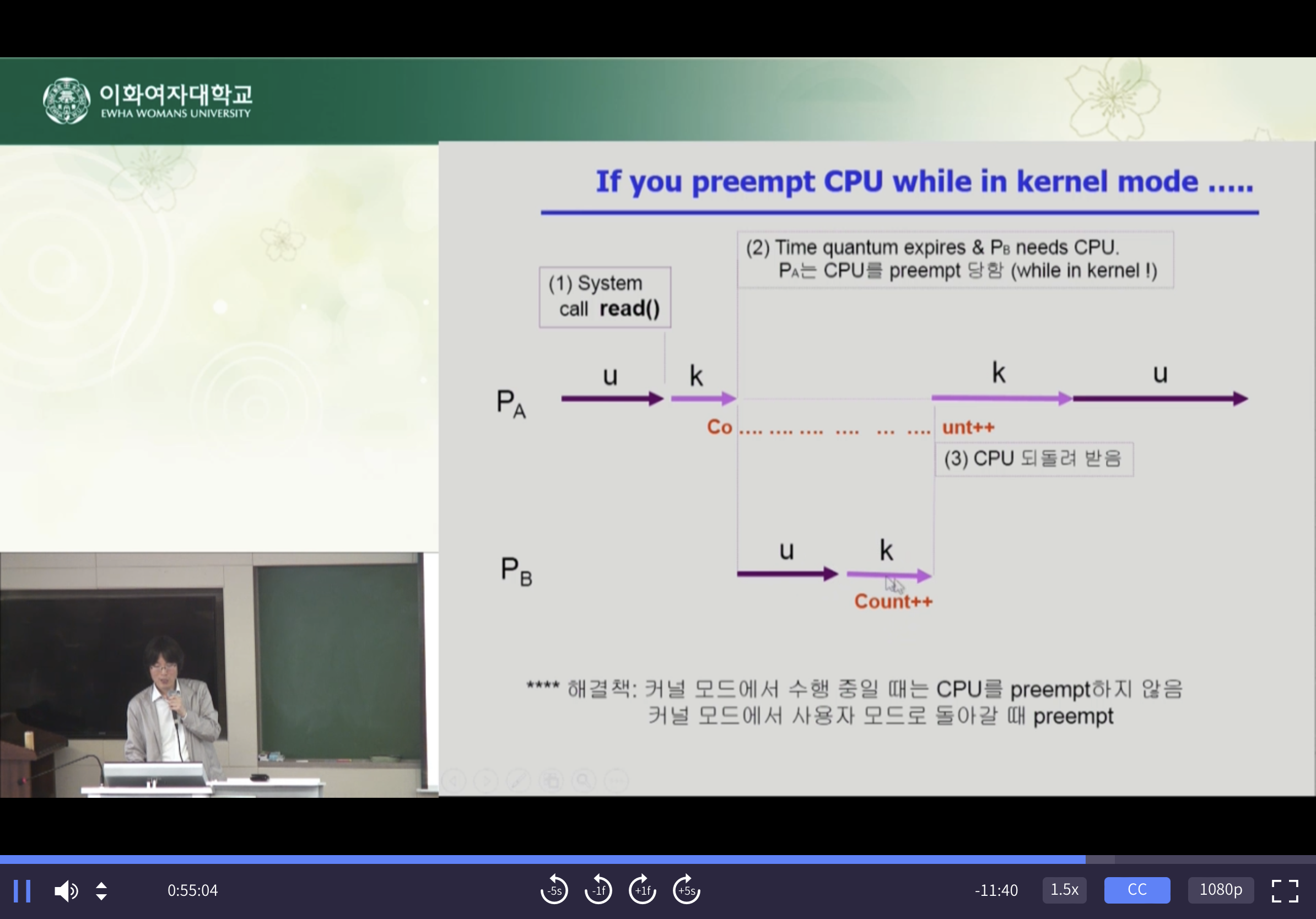 - Process가 System call을 하여 kernel mode로 수행 중인데 context switch가 일어나는 경우