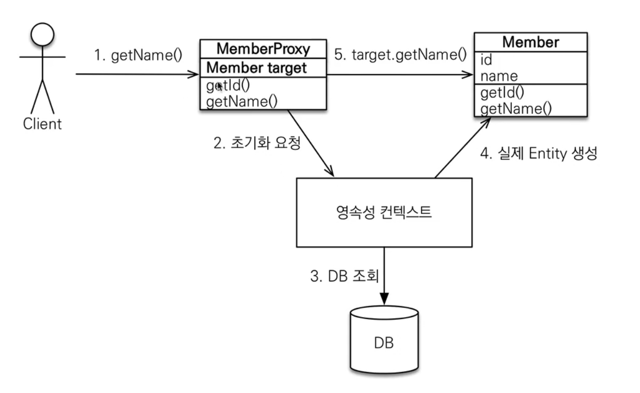 그리고 초기화를 하면 프록시 객체는 영속성 컨텍스트에 초기화 요청을 하고 영속성 컨텍스트는 DB를 조회한다 그럼 실제 Entity가 생성되고 그 Entity의 위치가 프록시 객체 target에 저장된다.