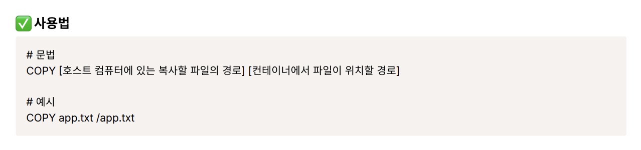 COPY: 호스트 컴퓨터에 있는 파일을 복사해서 컨테이너로 복사한다.