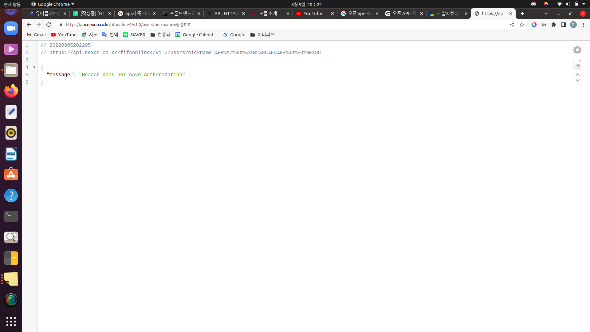 이런식으로 OPEN API를 이용하기 위한 키를 발급해준다. 이 키 없이 API를 이용하려는 경우, 권한이 없다는 메시지를 반환받게 된다.(메시지야 웹 사이트마다 차이가 있겠지만, API를 이용할 수 없다는 점에서는 똑같다.) 다음은 키를 요청의 header에 담지 않고 API를 이용하려 했을 때의 결과물이다.