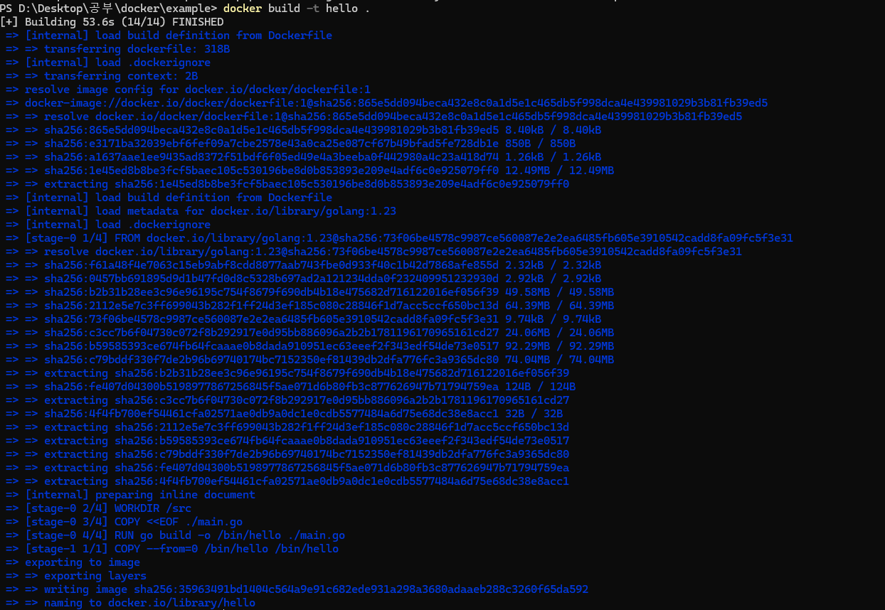 처음 golang:1.23을 이용한 단계에서는 main.go일 빌드하여 /bin/hello에 저장한다.