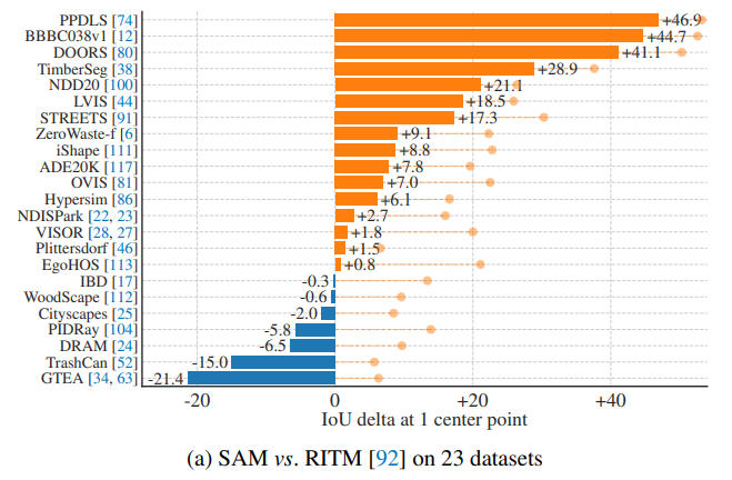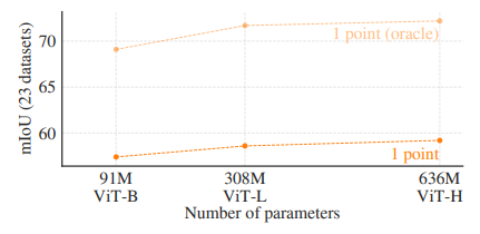 더 많은 point를 제공하는 경우 이러한 상호작용세분화 방법들이 SAM보다 더 높은 성능을 발휘할 것입니다. 하지만 SAM은 상호작용 세분화를 추구하지 않고 다양한 용도를 포괄하는 일반성을 추구합니다.