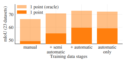 그림 13-1에 표기된 세가지 단계를 사용했을 때, 자동생성 마스크는 수동, 반자동 마스크보다 훨씬 많았습니다. 이를 해결하기 위해 수동 혹은 반자동 마스크를 10배 더 샘플링 했습니다. 그러나 이 과정은 복잡하니다. 따라서 마지막 단계 즉 자동으로 생성된 마스크만을 사용하는 훈련을 진행하였습니다. 이는 모든 데이터의 사용보다 0.5 mIoU가 낮은 성능을 보입니다. 결론적으로 훈련의 단순화를 위해 마지막 단계를 사용합니다.