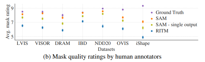 SAM과 VIT에서 생성된 Mask를 주석자들에게 요청하여 비교할 시 SAM이 더 좋은 성능을 보이는 것을 확인할 수 있었습니다.