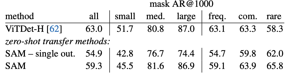 표5를 확인할 때에 ViTDeT-H은 SAM보다 지표상 더 높은 점수를 가지는 것을 확인할 수 있습니다. 그러나 출력을 시각화했을 때에 SAM의 마스크가 VITDet보다 경계가 더 선명하게 출력되는 경우가 잦았습니다.