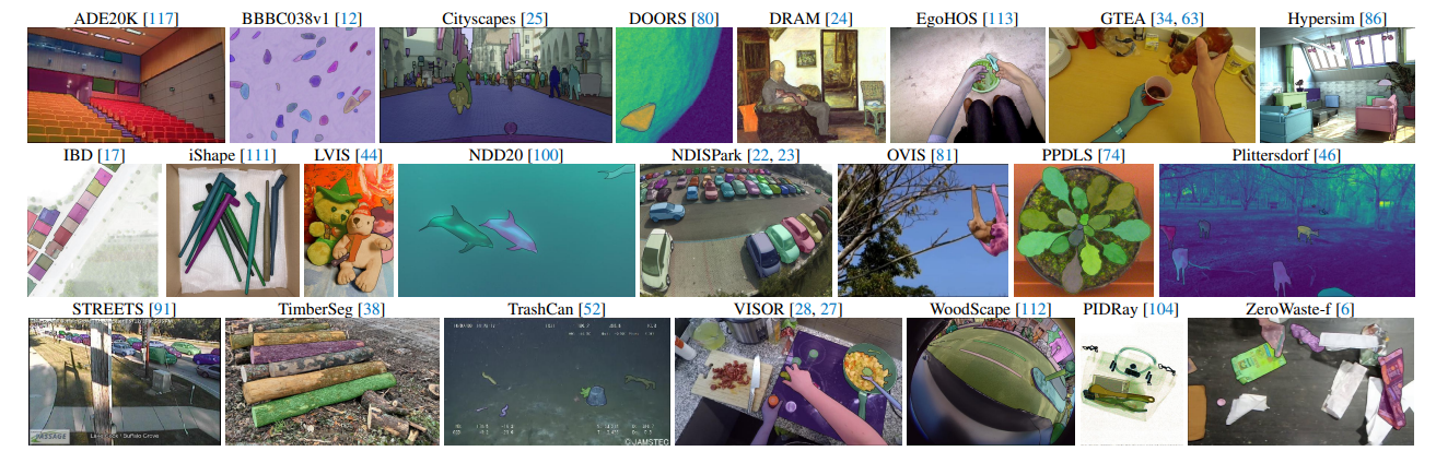 데이터 셋은 다양한 이미지 분포를 가진 23개의 데이터 셋 모음을 사용합니다. 데이터 셋에 속해있는 목록과 각 데이터의 샘플을 나타냅니다.