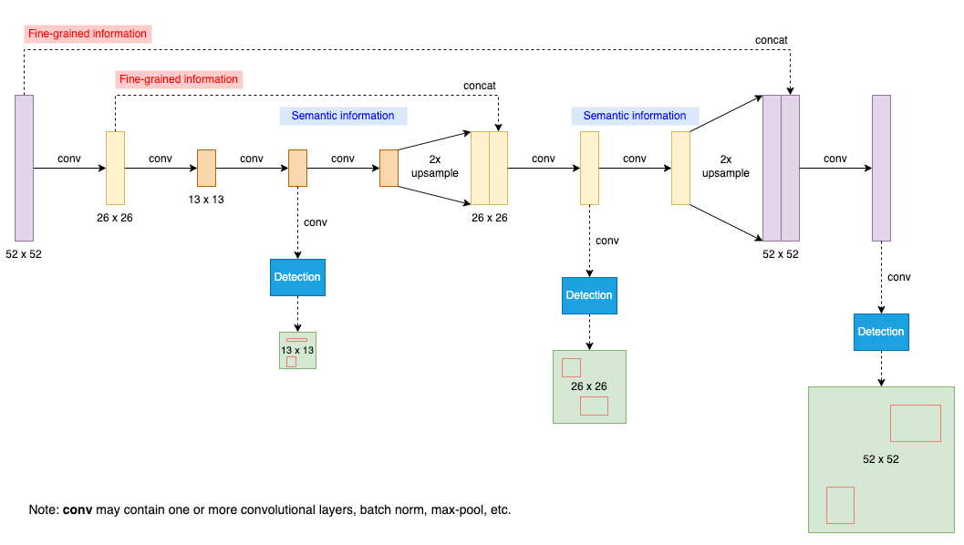 YOLOv3에서는 3개의 다른 스케일에서 상자를 예측합니다.