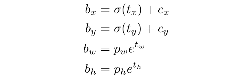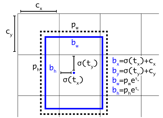Yolov3 또한 Yolov2와 같이 k-clustering을 사용하여 앵커 박스를 예측합니다. 네트워크는 각 경계 상자에 대해 4개의 좌표 (tx, ty, tw, th)를 예측합니다. 셀이 이미지의 왼쪽 상단 모서리로부터 (cx, cy)만큼 오프셋 되고, 앵커 박스의 너비와 높이가 pw, ph일 때 예측은 다음과 같이 적용됩니다.
