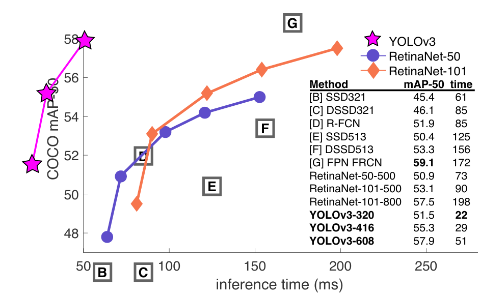 위의 표는 mAP 0.5 IOU 지표에서의 속도/정확도 절충을 나타냅니다.