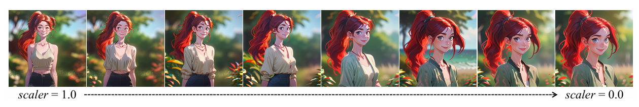 추론 시, 개인화된 T2I 모델은 동작 모듈과 필요에 따라 MotionLoRA를 포함시켜 애니메이션을 생성한다. 도메인 어댑터는 모델에 주입되어 스칼라 값의 조정을 통해 기여도를 조절한다. 이 모든 과정은 시각적 내용의 변화를 시간에 따라 포착하여 애니메이션의 동작 동역학을 구현하는 데 중점을 둔다.