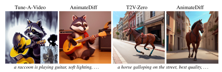 AnimateDiff는 실용적인 파이프라인으로 이는 개인화된 텍스트-이미지(T2I) 모델을 품질 저하나 사전 학습된 도메인 지식의 손실 없이 한 번에 애니메이션 생성으로 직접 전환한다.