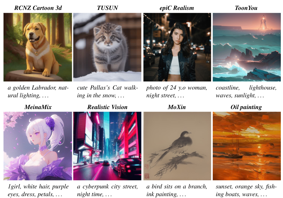 T2I는 특정 "트리거 단어"에만 반응하기 때문에, 일반적인 텍스트 프롬프트 대신 모델 홈페이지를 참조하여 평가 프롬프트를 구성했다. 아래의 각 샘플은 독특한 개인화된 T2I이다.