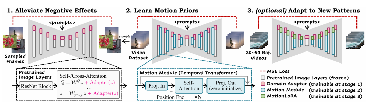 핵심은 비디오 데이터셋에서 합리적인 동작 선행 사항을 학습하는 plug and play 동작 모듈을 훈련하는 것으로 AnimateDiff의 동작 모듈 훈련은 세 단계로 구성된다.