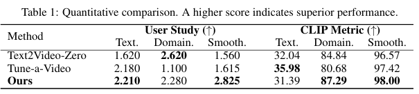 기존에 개인화된 T2I를 애니메이션화하기 위해 특별히 설계된 기존 방법이 없기 때문에, 우리는 이 작업에 적용할 수 있는 두 개의 최근 비디오 생성 작업인 Text2Video-Zero와 Tune-a-Video의 이미지와 비교했다.