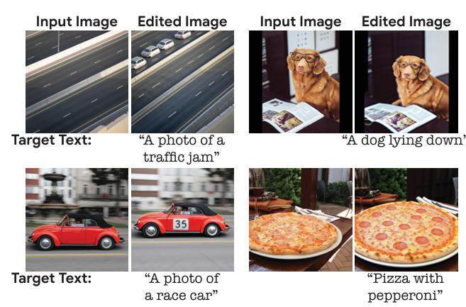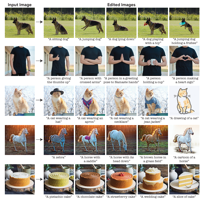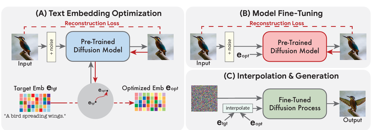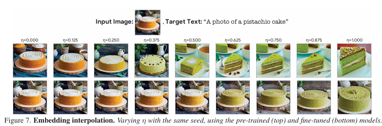 이를 위해, 사전 훈련된 텍스트-이미지 확산 모델을 사용하여 입력 이미지를 나타내는 텍스트 임베딩을 찾는다. 그런 다음, 이미지를 더 잘 맞게 하기 위해 확산 모델을 세밀하게 조정하고, 마지막으로 이미지를 나타내는 임베딩과 대상 텍스트 임베딩 사이를 선형으로 보간하여 이들의 의미 있는 조합을 얻는다. 이를 통해 보간된 임베딩을 사용하여 편된 이미지를 제공할 수 있다.