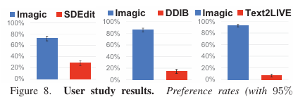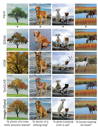 Imagic은 Text2LIVE, DDIB 및 SDEdit과 비교하여 단일 입력 실제 이미지를 기반으로 텍스트 프롬프트에 따라 편집하는 기술들과 비교된다.