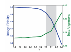 η 값이 0.6~0.8인 경우에 가장 만족스러운 결과를 얻을 수 있다. 그러나 CLIP 점수와 LPIPS 점수는 각 입력 이미지-텍스트 쌍마다 다르게 측정되므로 실제로는 자동으로 η를 선택하거나 편집 방법의 성능을 평가하는 데 적합하지 않다.