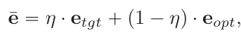 생성적 확산 모델이 최적화된 임베딩에서 입력 이미지 x를 완벽하게 재생성하도록 훈련되었으므로, 목표 텍스트 임베딩 etgt 방향으로 진행하도록 편집을 한다. 이 단계는 etgt와 eopt 사이의 단순한 선형 보간으로 아래는 원하는 편집된 이미지를 나타내는 임베딩이다.