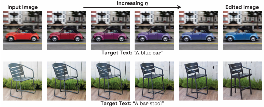 최적화된 텍스트 임베딩과 대상 텍스트 임베딩 사이를 원활하게 보간할 수 있으므로 η 증가함에 따라 필요한 텍스트에 맞게 입력 이미지를 편집 가능