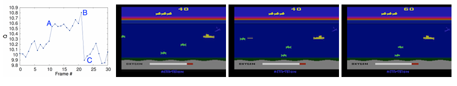 guSeaquest 게임에서 학습된 가치 함수를 시각화한 것으로 적이 화면 왼쪽에 나타난 후(지점 A) 예측된 가치가 급상승하는 것을 보여준다. 에이전트가 적에게 어뢰를 발사하고, 어뢰가 적에게 맞기 직전(지점 B)에 예측된 가치가 최고조이다. 마지막으로, 적이 사라진 후 가치가 대략 원래 값으로 돌아갑니다(지점 C). Figu이는 논문의 방법이 비교적 복잡한 일련의 사건들에 대해 가치 함수가 어떻게 변하는지를 학습할 수 있음을 보여준다.
