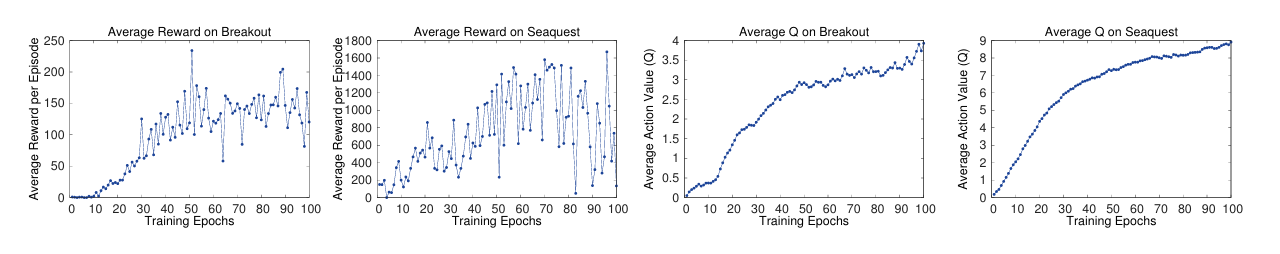 왼쪽 두 그래프는 훈련 중 평균 총 보상이 불안정하여 꾸준히 증가하는 것처럼 보이지 않지만 오른쪽 두 그래프는 에이전트가 얻은 평균 총 보상보다 예측된 평균 𝑄가 훨씬 더 부드럽게 증가함을 보여준다.