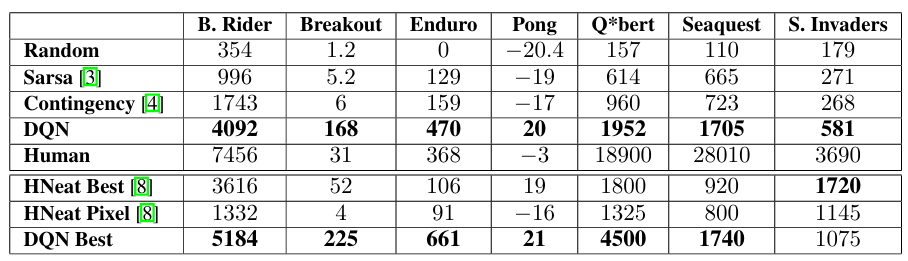 DQN 접근 방식은 7개 게임 모두에서 다른 학습 방법을 크게 능가했으며, Breakout, Enduro, Pong에서는 전문가 인간 플레이어보다 더 나은 성능을 보였다. Q*bert, Seaquest, Space Invaders에서는 더 긴 시간 규모에 걸친 전략을 요구하기 때문에 아직 인간 성능에 미치지 못했다.