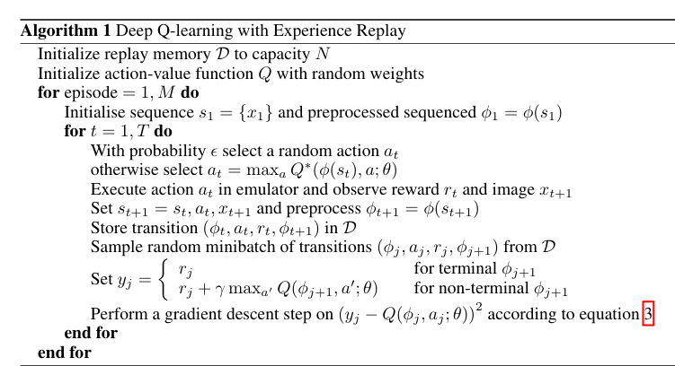 손실 함수를 확률적 경사 하강법으로 최적화하여 Q-러닝 알고리즘을 구현한다. 이 알고리즘은 모델 프리 방식으로, 에뮬레이터에서 샘플을 사용해 강화 학습 과제를 직접 해결한다. off-policy를 사용하여 상태 공간을 충분히 탐색하는 행동 분포를 따르며, a=max_a Q(s, a; θ)인 greedy 전략을 학습한다.