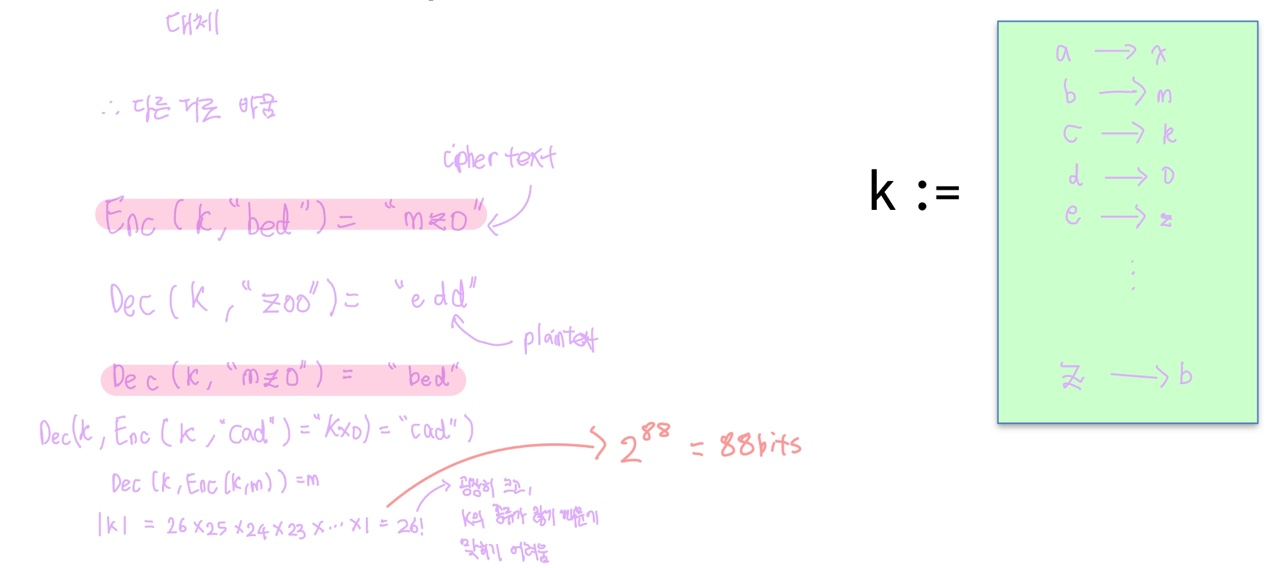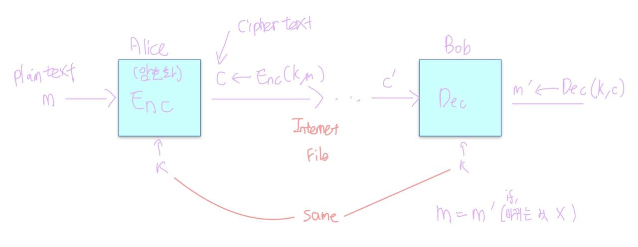 Dec: key k와 cipher text c를 이용해 message m을 복호화 하는 decryption algorithm