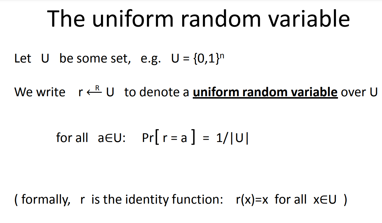 균등 확률 변수: Pr[r=a] 의 확률이 모두 1 / |U| 로 같아서, 어떤 확률변수를 갖더라도 모두 같은 값을 가진다.