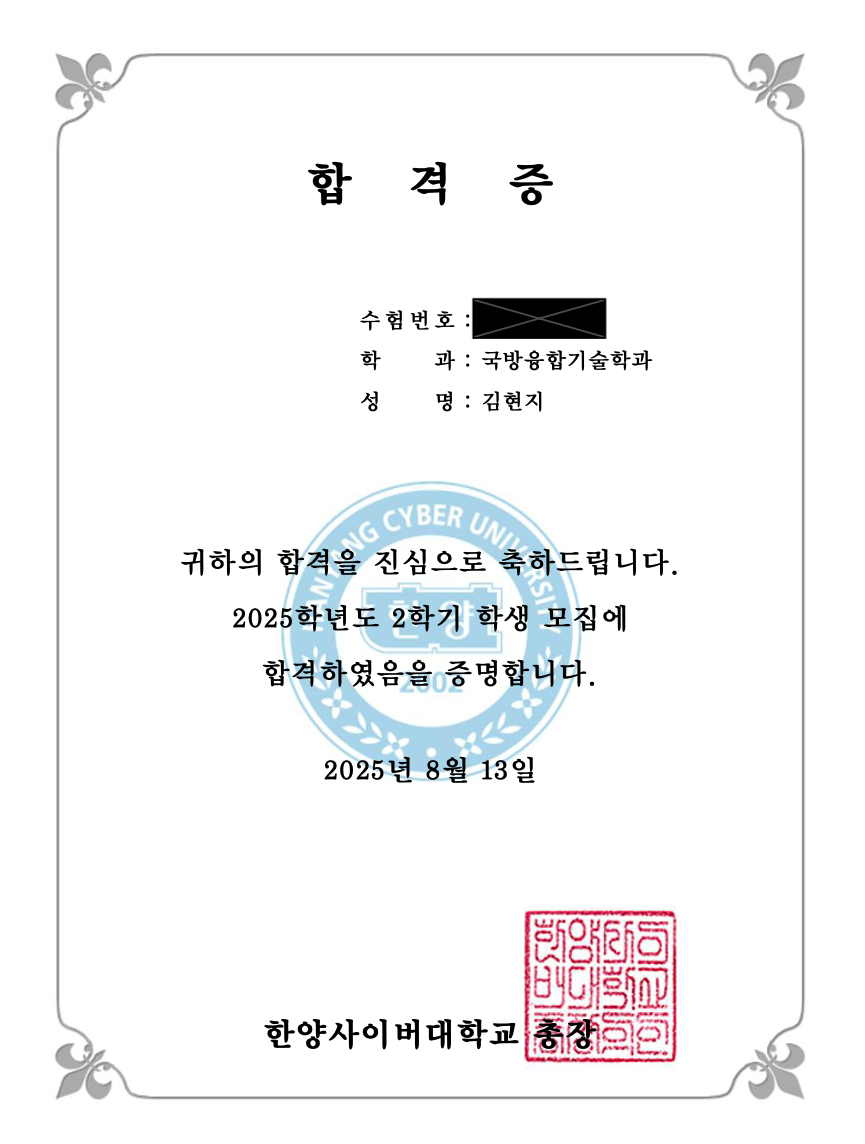 한양사이버대학교에 2025-2학기 신입학으로 지원하여 합격하였습니다.