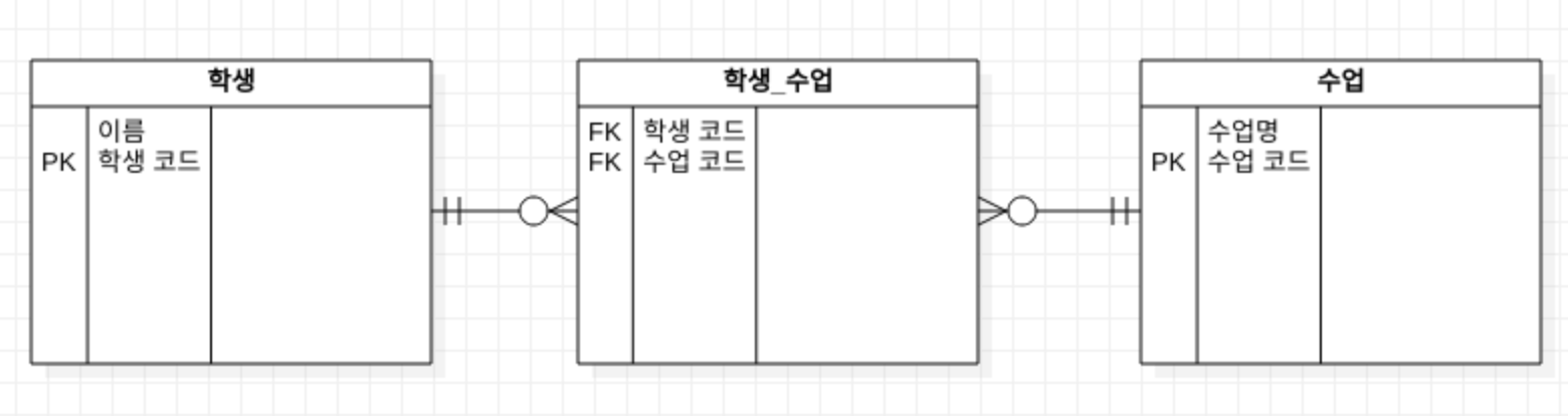 ✍ 데이터베이스 관계는 1:1, 1:N, M:N이 존재한다. 예를 들어 한 명의 학생은 하나의 신체정보를 갖게 되서 1:1, 한 명의 학생은 여러 강의를 들을 수 있어서 1:N이다. 여기서 문제는 M:N인데, 한 명의 학생은 여러 강의를 들을 수 있고 강의는 여러 학생을 수용한다. M:N 관계를 논리적으로 표현 할 수 있지만, 2개의 테이블로 구현하는 것은 불가능하다. 이 사이에 연결되는 관계 테이블을 넣어서 M:1:N 방법으로 해결해야 한다.