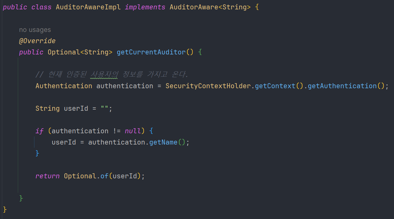 AuditorAwareImpl은 작성자 정보를 반환하는 사용자 정의 클래스이다.