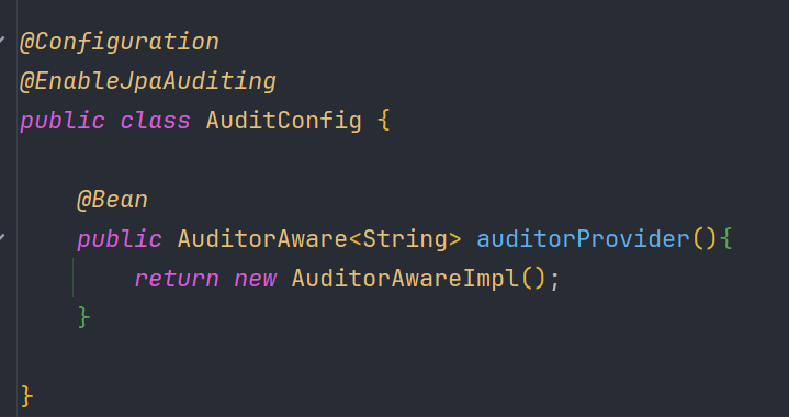 Spring Data JPA에서 Auditing 기능 (자동으로 생성일자/수정일자, 작성자/수정자 등을 기록하는 기능)을 사용하기 위한 설정 클래스이다.