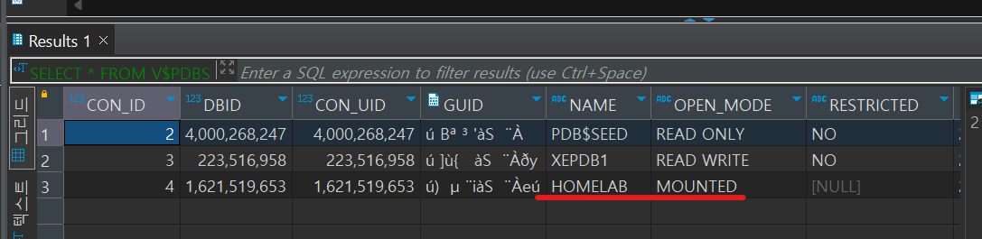 ALTER pluggable DATABASE homelab OPEN READ WRITE;