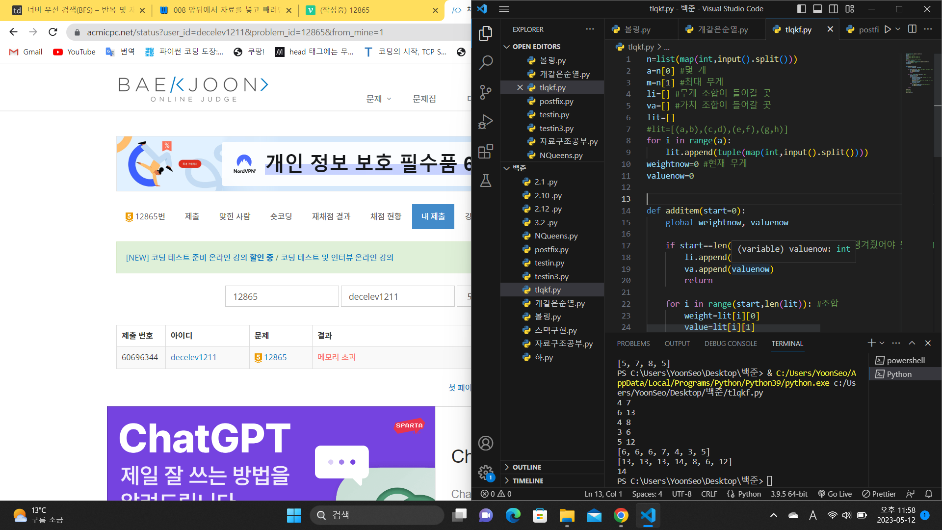 어떤 사람은 백트래킹으로 했더니 시간 초과가 나서 DP (Dynamic programming) 동적 프로그래밍으로 풀었다는데..