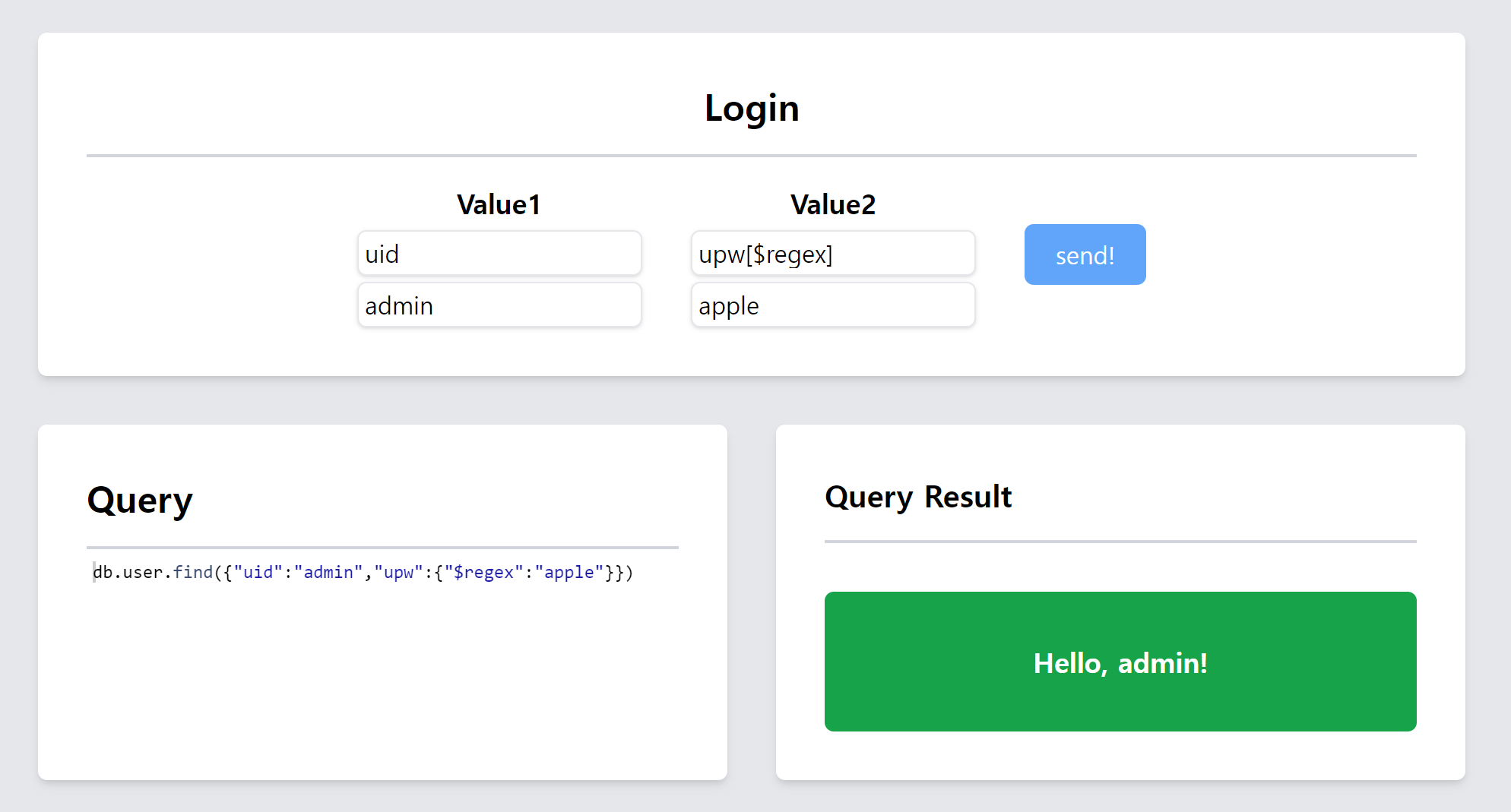 {"uid": "admin", "upw": {"$regex":"^apple$"}}