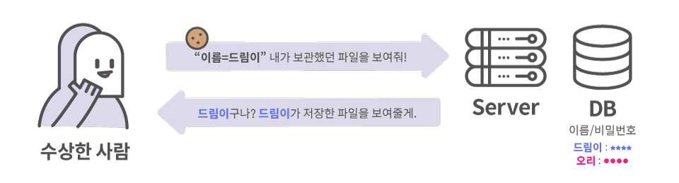 따라서, 악의적인 클라이언트는 쿠키 정보를 변조해 서버에 요청을 보낼 수 있다