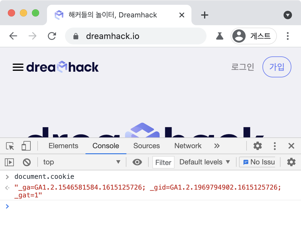 크롬 페이지에서 우클릭했을 때 표시되는 검사 버튼을 누른 후 Console 탭을 누릅니다. document.cookie를 입력하면 쿠키 정보를 확인할 수 있습니다.