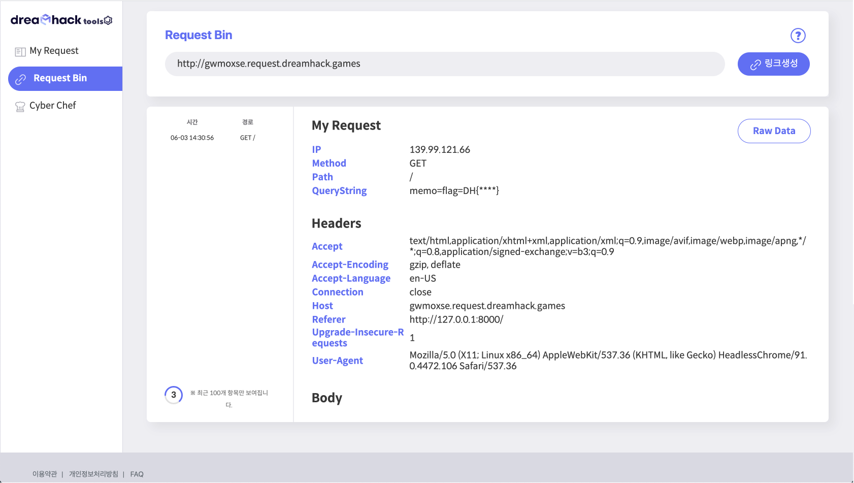 드림핵에서 제공하는 서비스를 사용할 수 있습니다. 해당 서비스에서 제공하는 Request Bin 기능은 이용자의 접속 기록을 저장하기 때문에 해당 정보를 확인할 수 있습니다. Request Bin 버튼을 클릭하면 랜덤한 URL이 생성되며, 해당 URL에 접속한 기록을 저장합니다.