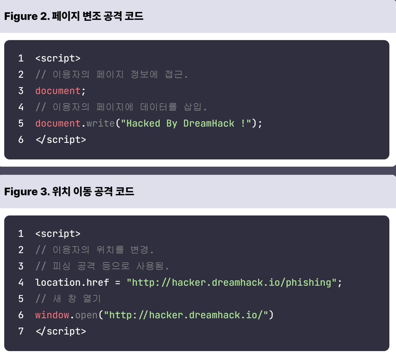 공격자는 자바스크립트를 통해 보여지는 페이지를 조작하거나 웹 브라우저의 위치를 임의의 주소로 변경할 수 있다.