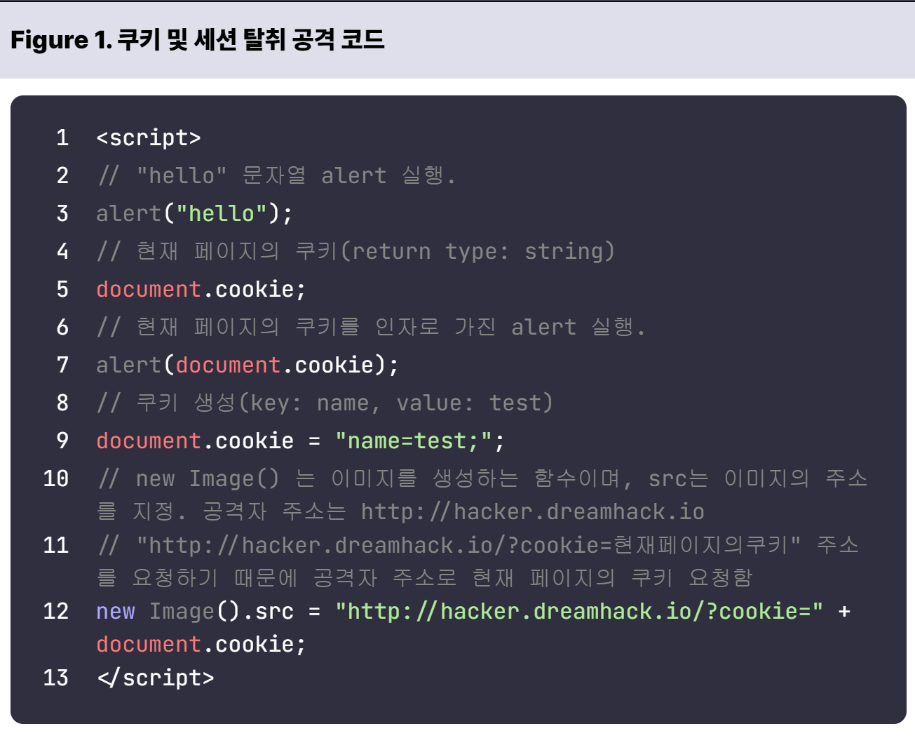 예를 들어 드림핵 웹 페이지에서 XSS 취약점이 존재하면 https://dreamhack.io 내에서 오리진 권한으로 악성 스크립트를 삽입 후 이용자가 악성 스크립트가 포함된 페이지를 방문하면 공격자가 임의로 삽입한 스크립트가 실행되어 쿠키 및 세션이 탈취될 수 있다